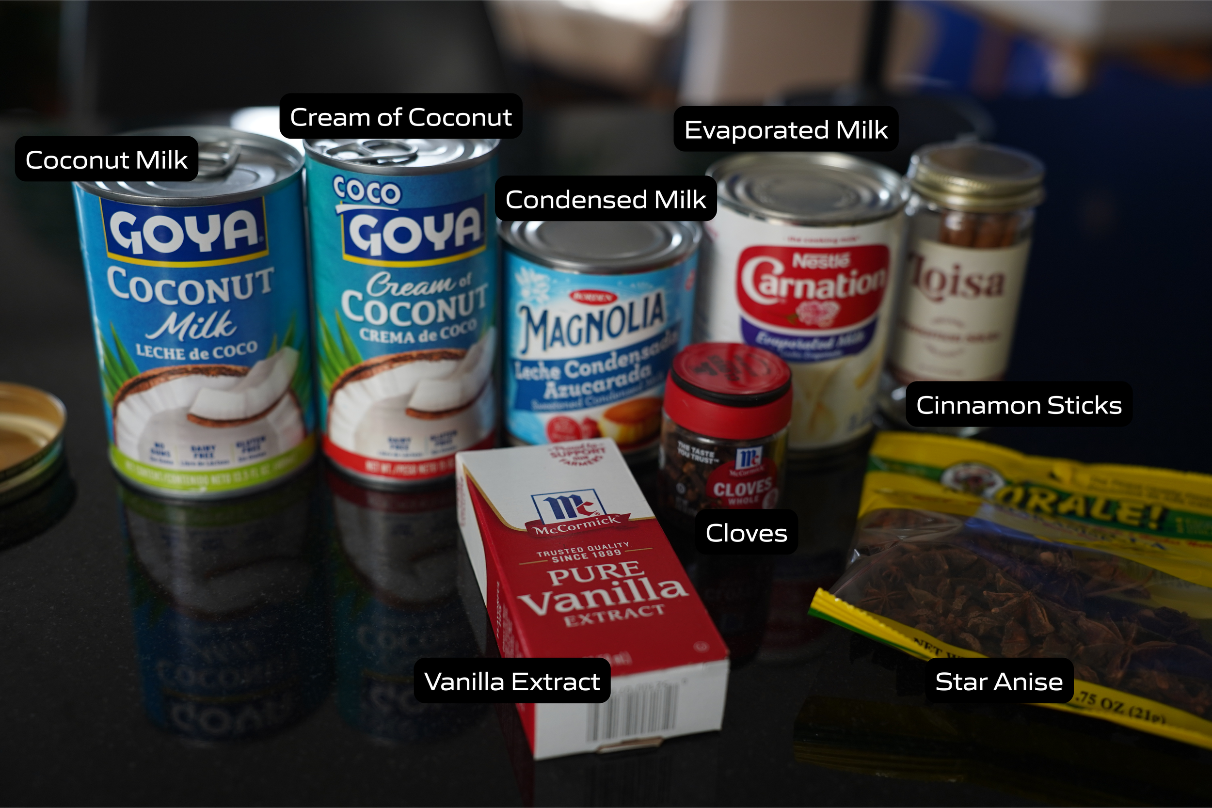 Add your tea, cream of coconut, coconut milk, evaporated milk, condensed milk, and vanilla to a blender.